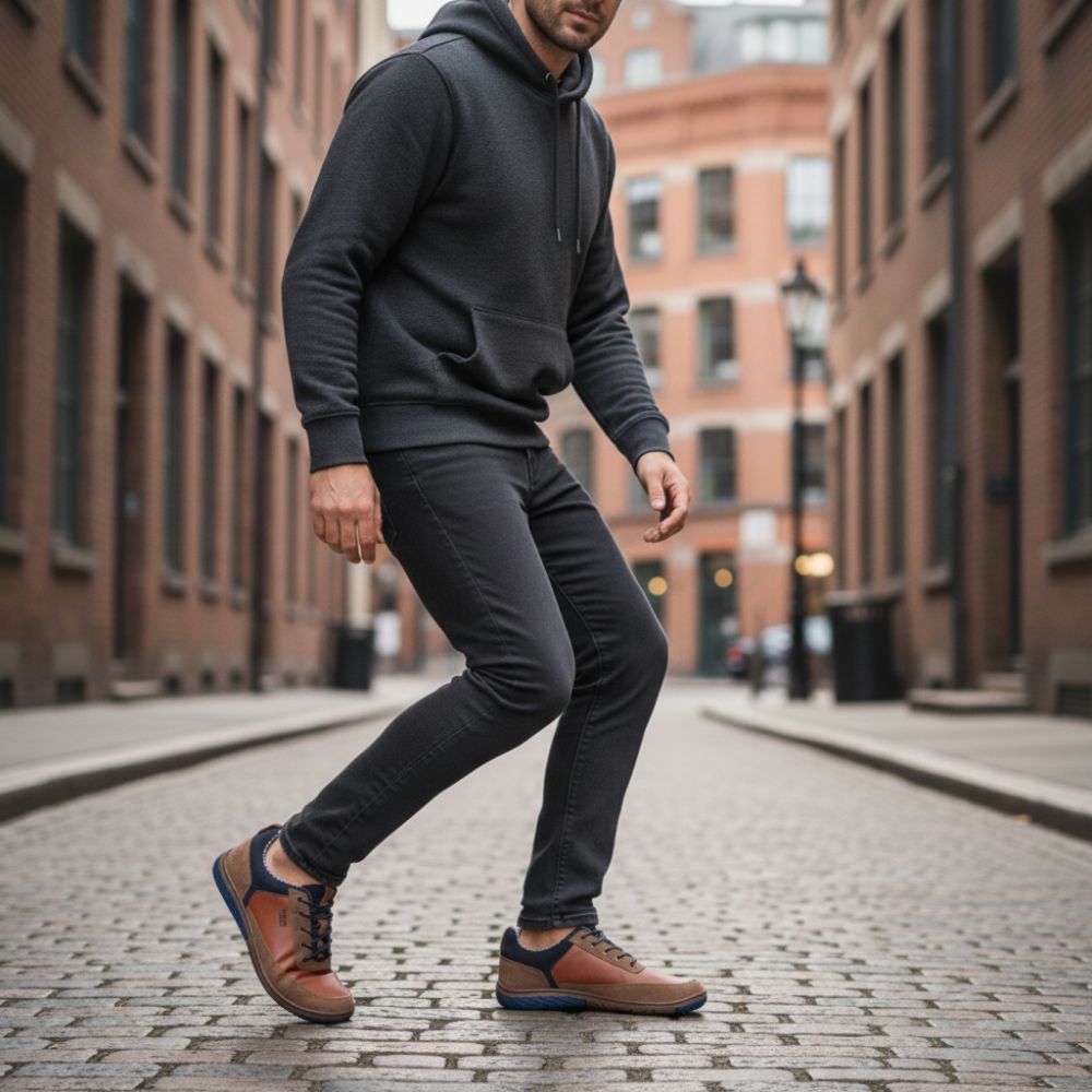 - Kautschuksohle mit Nullabsatz, dadurch Entlastung der Wirbelsäule und Schonung der Gelenke, unterstützt die natürliche Körperhaltung