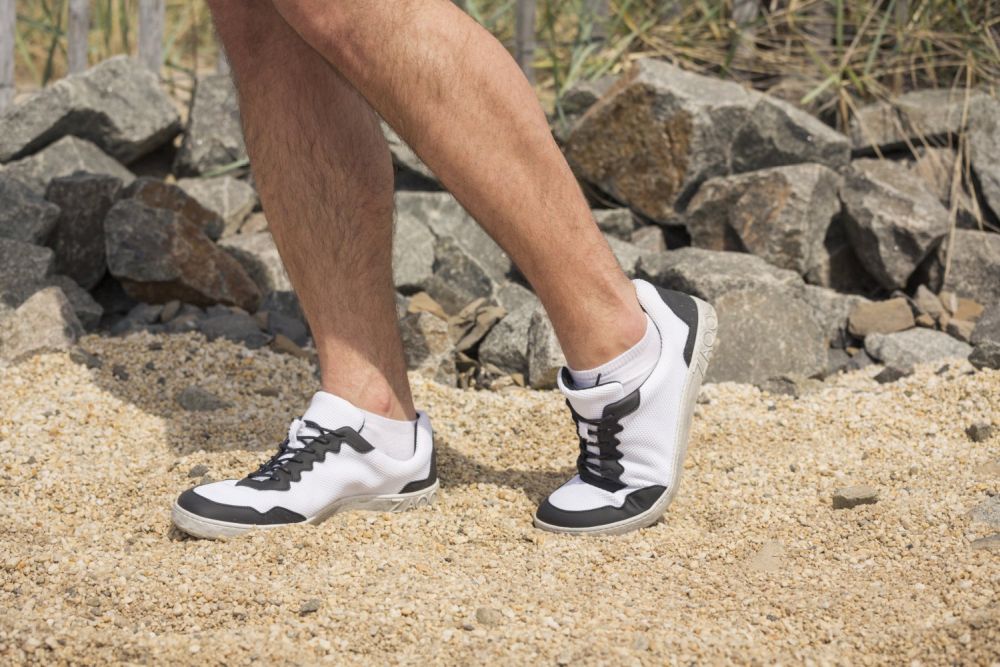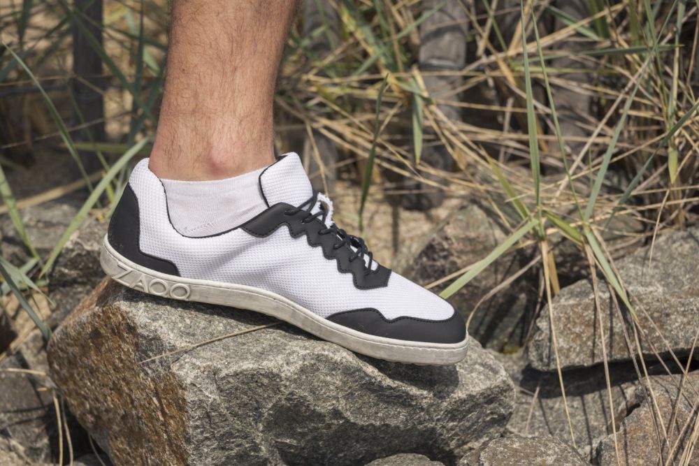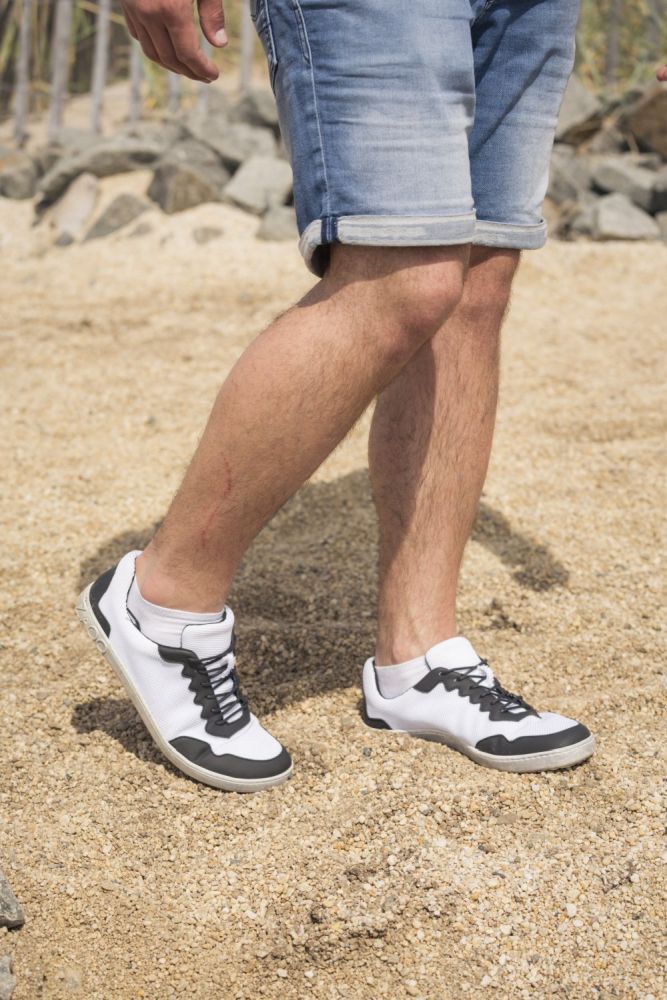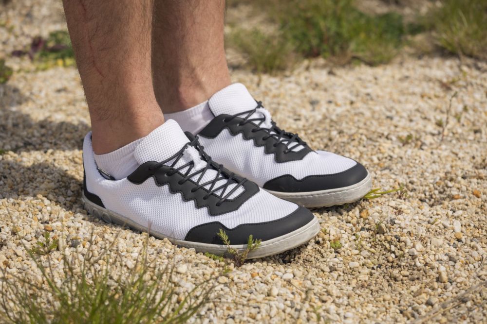 With its white-black mix of materials, the bright barefoot sneaker is not only visually the hit, but also functional.