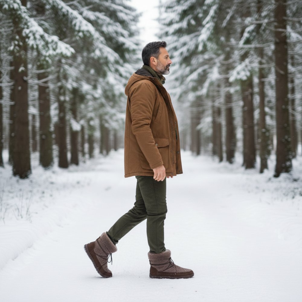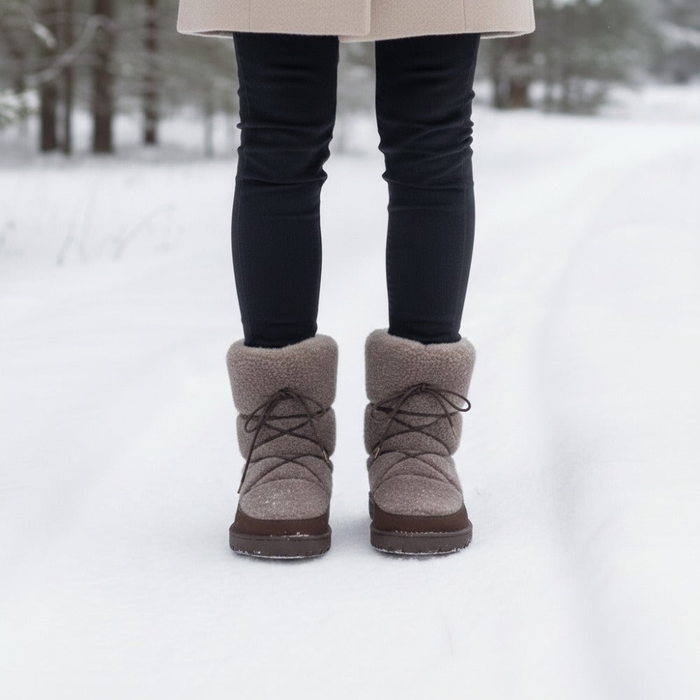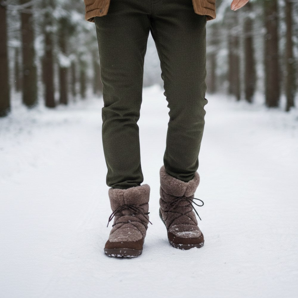 In the lower area, we have handled high -quality nubucel leather by hand to the barefoot sole. This makes the winter boots extremely robust, stable and durable. In the upper area, our HyggeliQ consists of cozy lambskin. This gives the barefoot boot its incomparable look. You would like to stroke him right away, right? You can tie up the half -high boot closer or widen over the laces that discreetly hide in the high lambskin fur or widen if necessary. So he always sits perfectly on your foot. Cold feet belong to the past, with Hyggeliq you are cozy and warm from the sole to the calf.