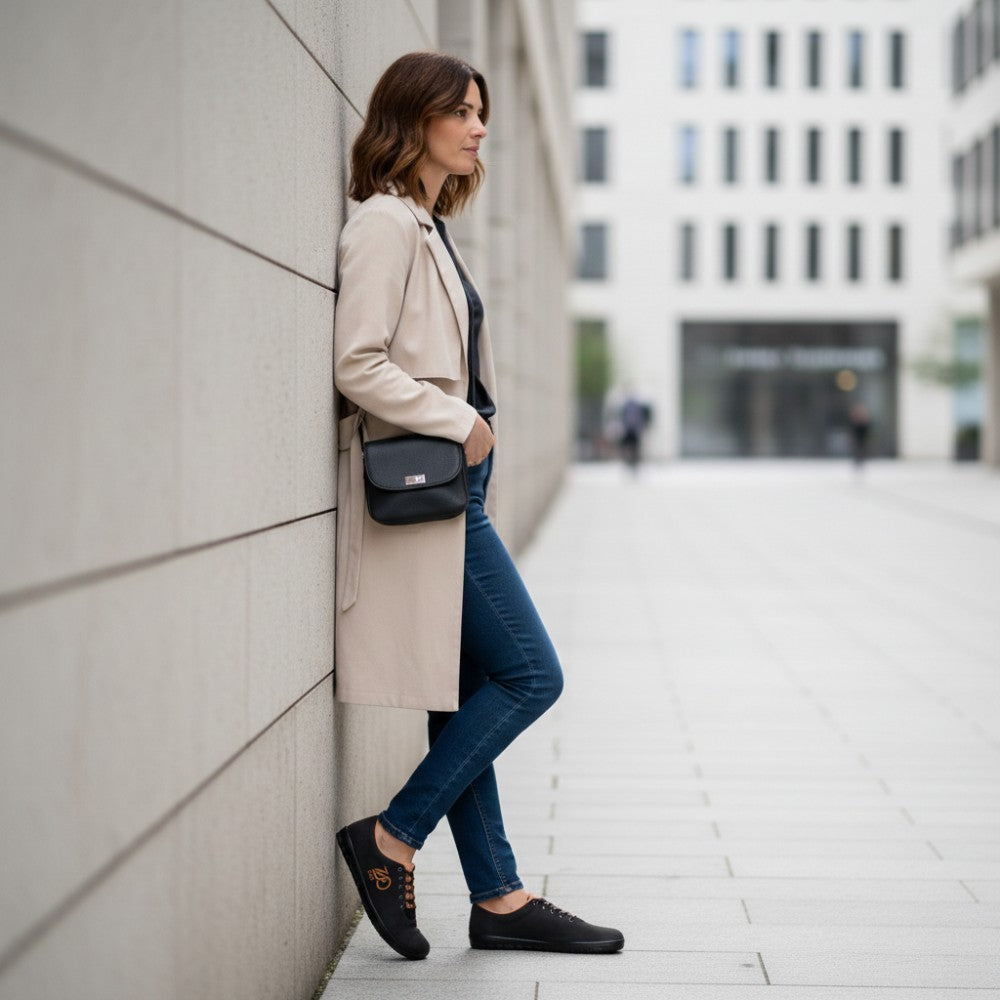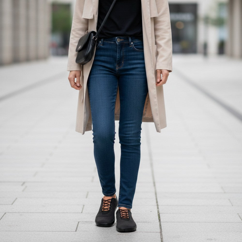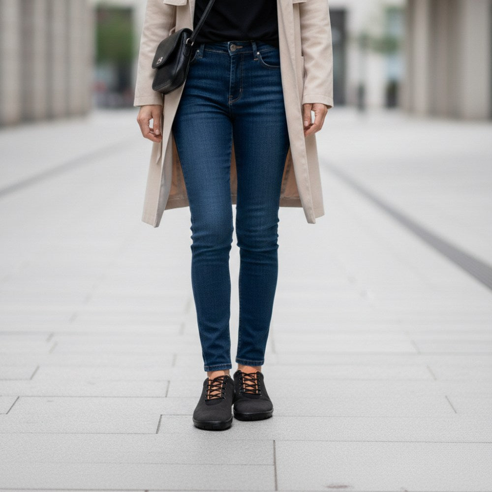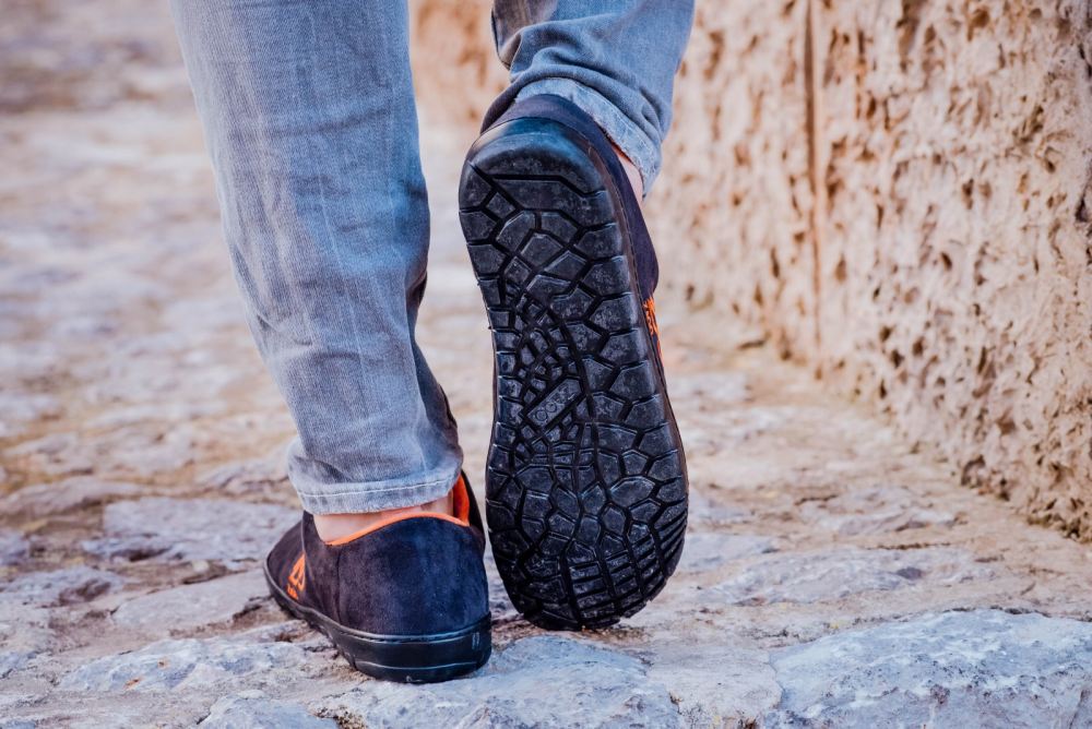 Qaro Black Orange is the perfect companion for jeans. With its orange accents, this vegan barefoot sneaker is something very special without dancing too much out of line.