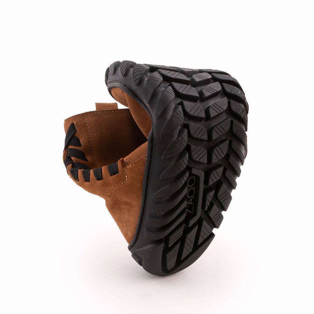 Das weiche Veloursleder in warmem Braun trifft auf eine kuschelige Innenfütterung, die sofort angenehm umschließt – ohne aufzutragen. Für maximale Trittsicherheit sorgt die ZAQQ ULTRAGRIP Sohle: ihr tiefes Profil bietet besonders rutschfesten Halt auf glattem Pflaster, Matsch und festgetretenem Schnee, bleibt dabei dünn und hochflexibel für pures Barfußgefühl. Der großzügige Zehenbereich lässt Deinen Füßen Raum, die Nullsprengung unterstützt ein natürliches Abrollen.