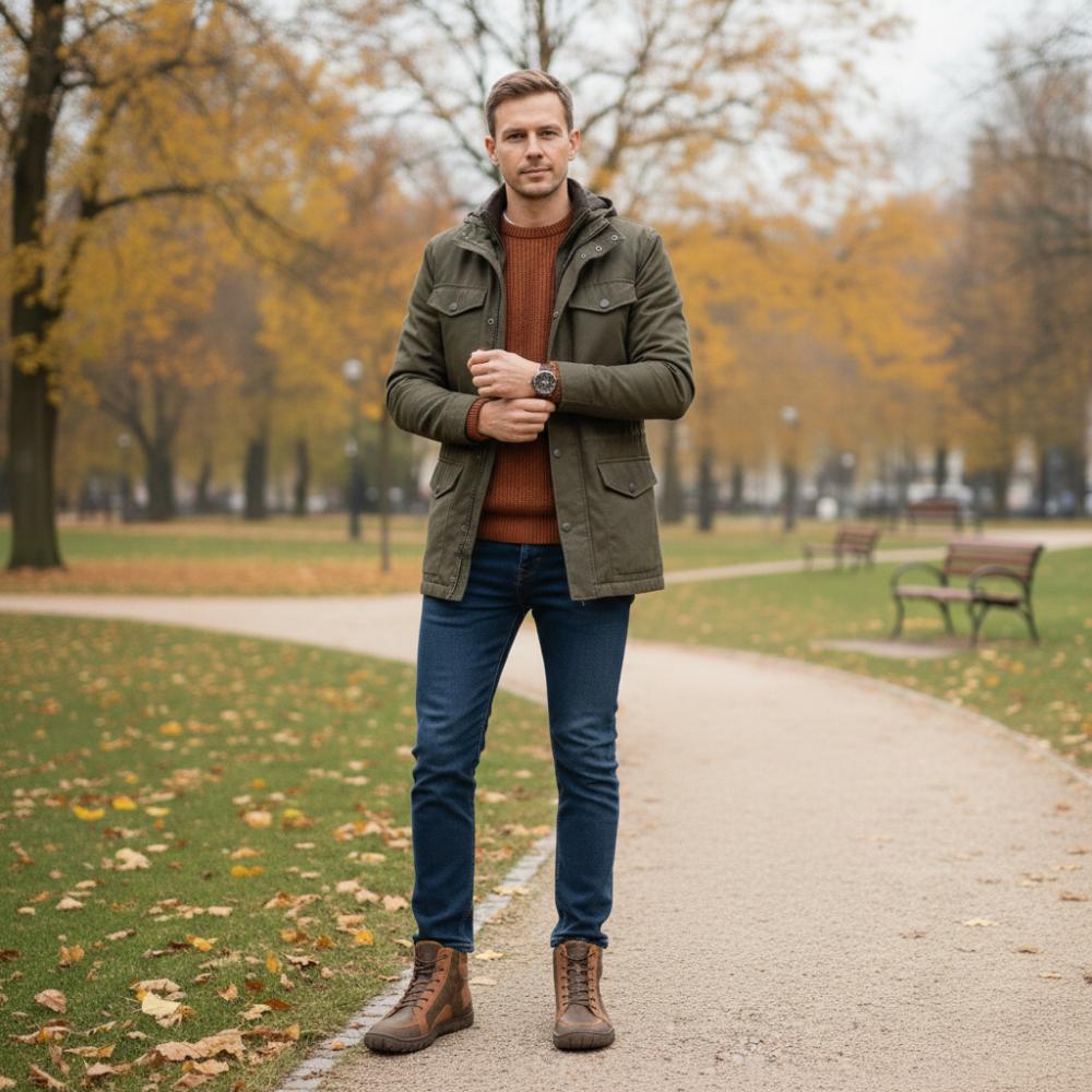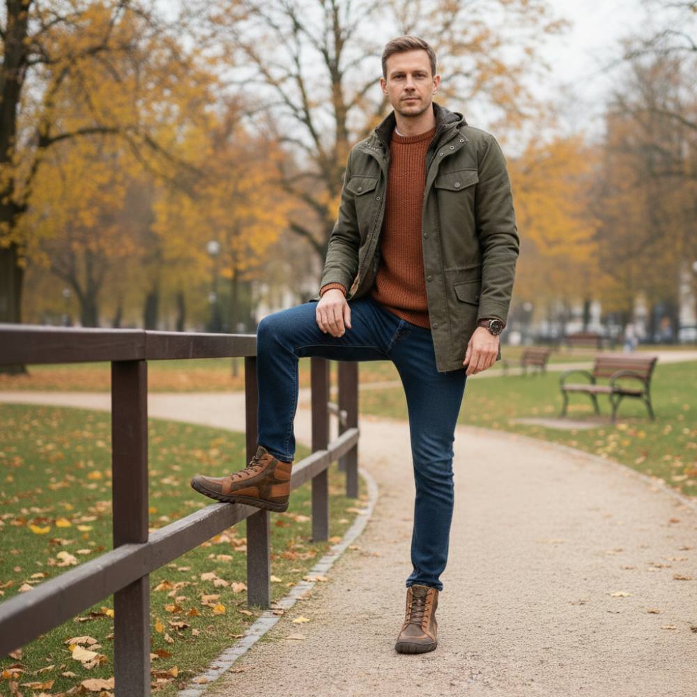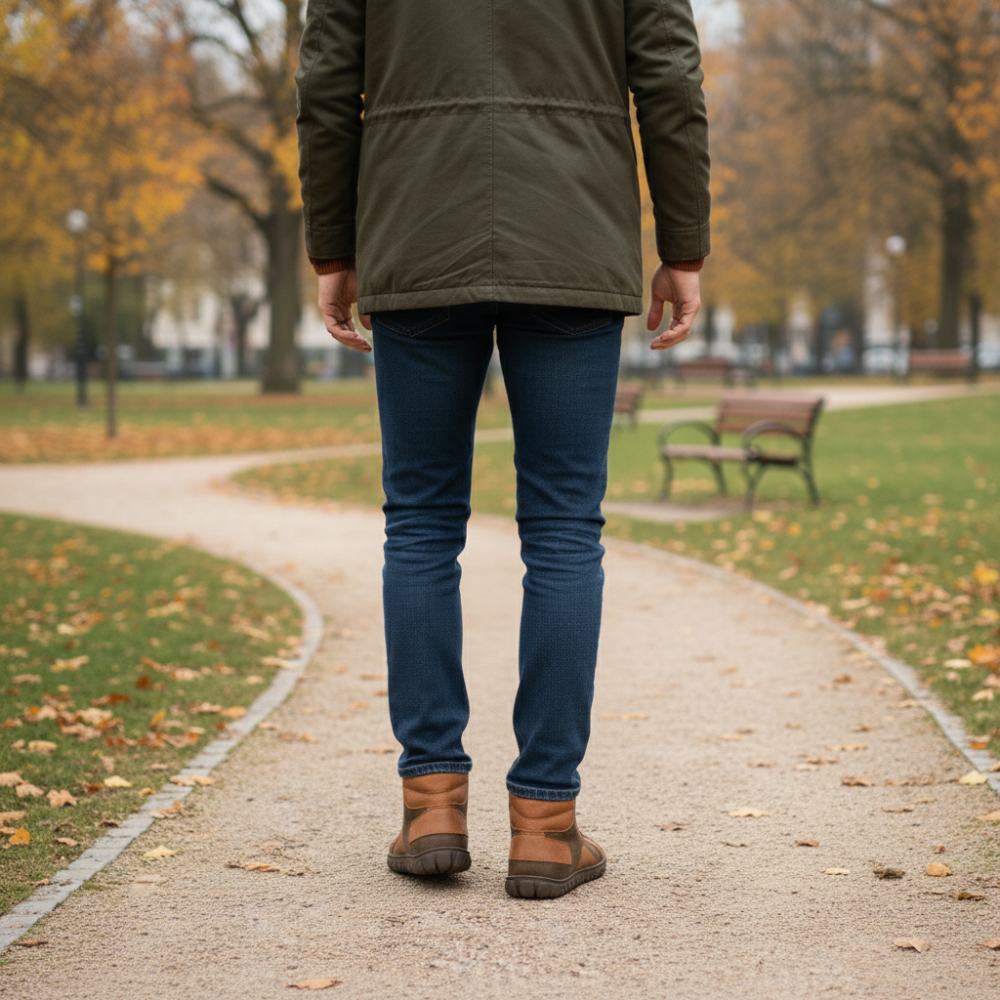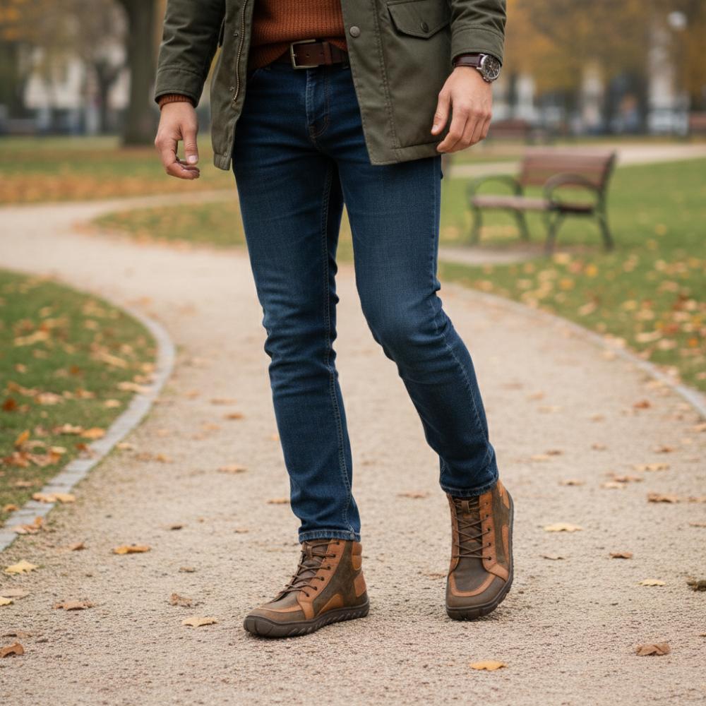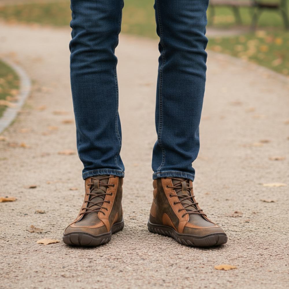 QOBAN Brown ist der Herrenschuh, der Robustheit und pures Barfußgefühl verbindet. Der markante Ledermix in warmen Brauntönen wirkt maskulin und hochwertig und die schnörkellose Mid-Cut-Silhouette sitzt leicht am Fuß.