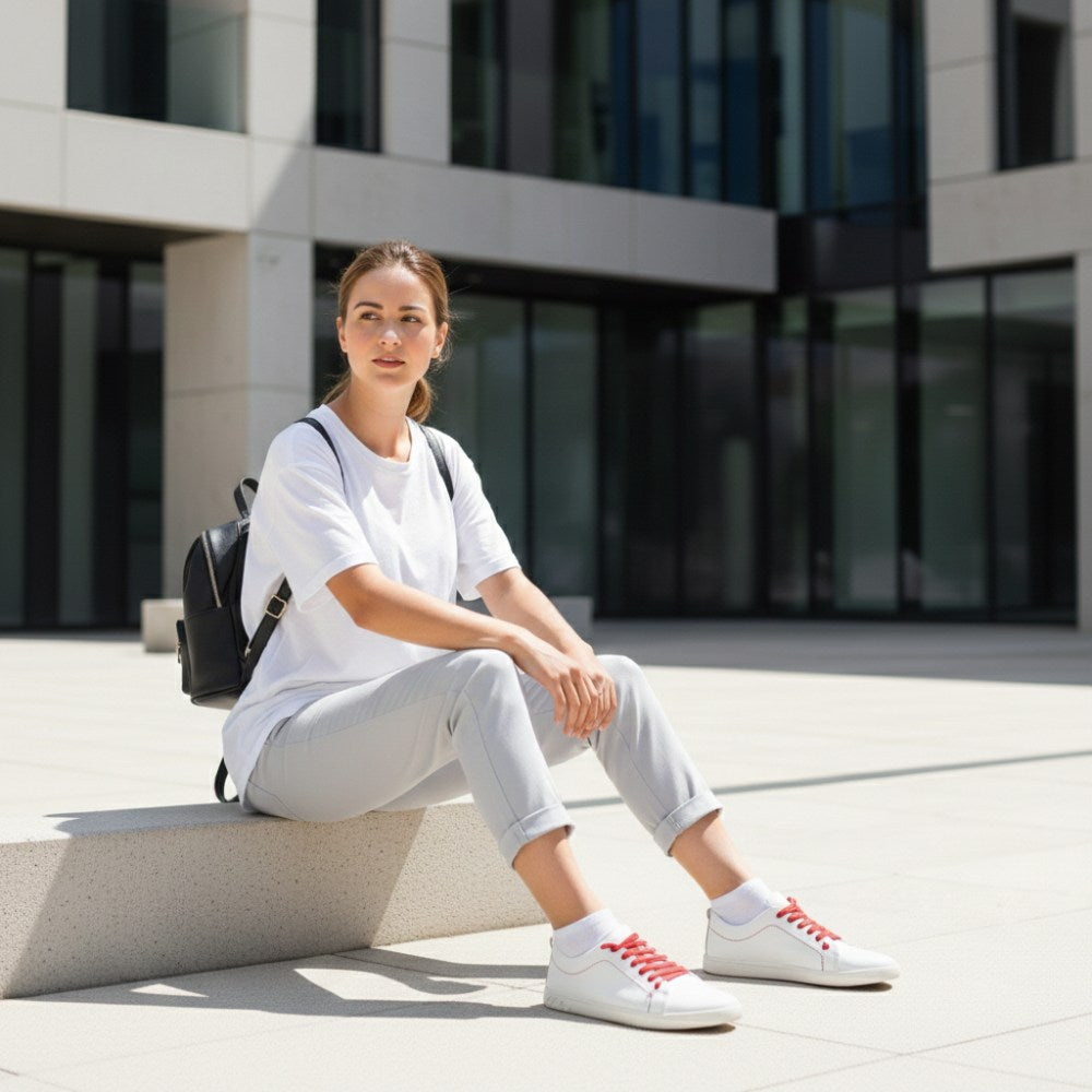 Are you looking for a modern sneaker that you always use for an eye -catcher? Then our model Straq White is your new barefoot shoe. All around in noble white and with bright red laces, this sneaker becomes a particularly stylish choice!